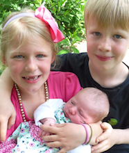 Liebes Praxis-Team! Alle guten Dinge sind drei. Vielen Dank auch für die dritte tolle Rundumbetreuung in der Schwangerschaft. Jule ist gesund und munter am 3.5.2015 mit 3820g und 53 cm um 5:50 Uhr auf die Welt gekommen. Die Geschwister sind mächtig stolz! Steffi und Reinier mit Tom, Emma und Jule